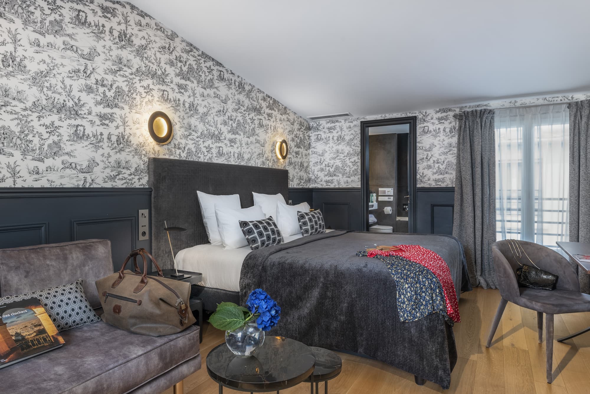 Véritable écrin au cœur du 1er arrondissement de Paris, la Junior Suite de l’Hôtel Cambon incarne une vision contemporaine du luxe : celui du temps, de l’espace et du confort. Ses 33 m² dévoilent de vastes volumes baignés de lumière naturelle, prolongés par un espace salon à la fois accueillant et raffiné. La méridienne, la bibliothèque ponctuée d’objets d’art et les lignes épurées du mobilier composent une atmosphère feutrée, idéale pour se détendre ou prolonger une journée parisienne.